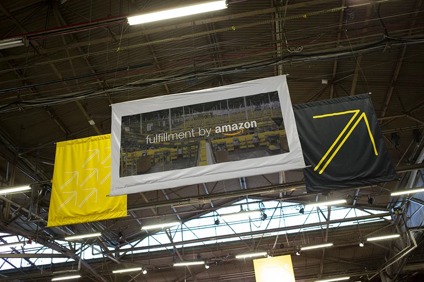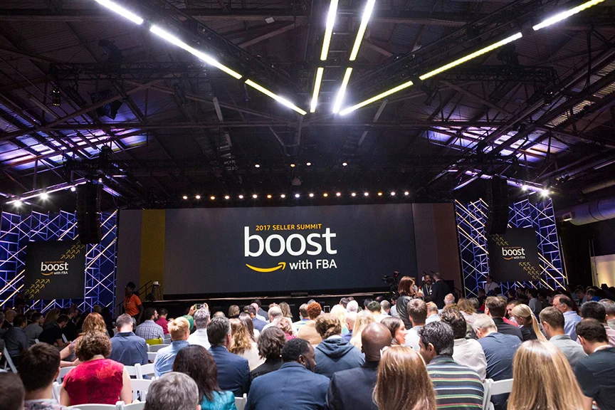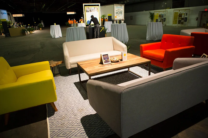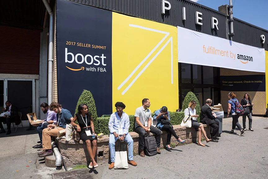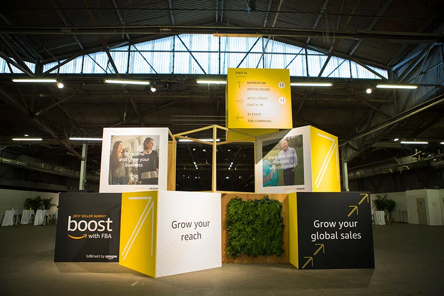 ACKNOWLEDGING THE IMPORTANCE OF ITS SMALL BUSINESS COMMUNITY, AMAZON REQUESTED AN EXPANSIVE CONFERENCE TO BRING ESTEEMED SELLERS TOGETHER FOR A MULTI-DAY LEARNING AND SOCIAL EXPERIENCE. EVENT BRANDING FOCUSED ON FORWARD MOTION AND PROGRESS AND THE SHEER VOLUME OF MANHATTAN’S PIER 94 ENCOURAGED LARGE-SCALE WAYFINDING AND SCULPTURAL INSTALLATIONS THAT GUIDED ATTENDEES THROUGHOUT AND PROVIDED A VARIETY OF MEETING AND PRESENTATION SPACES.